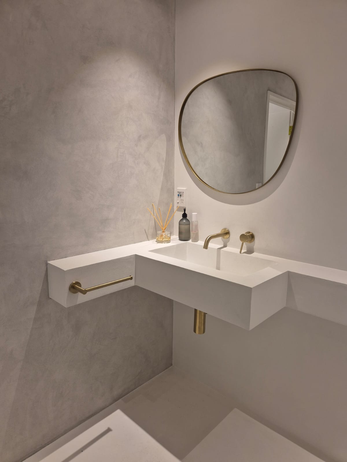 To bring this vision to life, every surface was coated in Cemher microcement, carefully trowelled to create a seamless, cloud-like texture that wraps gently around the room. Subtle tonal variations in colour enhance the feeling of movement and softness, while the fully waterproof finish ensures both beauty and function.